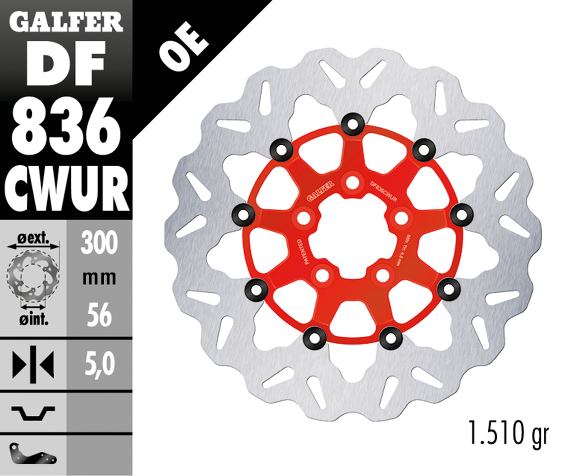 I dischi flottanti Galfer Wave offrono una frenata precisa ed efficiente e un notevole risparmio di peso. Se non diversamente indicato, sono dotati di nottolini in acciaio inox neri che fissano la pista frenante in acciaio inox alla parte centrale in alluminio. Sono utilizzabili con pinze di serie e di ricambio. Sono venduti singolarmente, ordinarne due per applicazioni a doppio disco. Come per ogni disco freno, si raccomanda vivamente di installare nuove pastiglie freno con un nuovo disco freno.