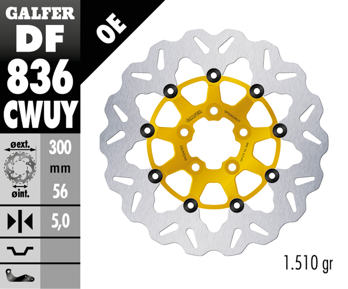 I dischi flottanti Galfer Wave offrono una frenata precisa ed efficiente e un notevole risparmio di peso. Se non diversamente indicato, sono dotati di nottolini in acciaio inox neri che fissano la pista frenante in acciaio inox alla parte centrale in alluminio. Sono utilizzabili con pinze di serie e di ricambio. Sono venduti singolarmente, ordinarne due per applicazioni a doppio disco. Come per ogni disco freno, si raccomanda vivamente di installare nuove pastiglie freno con un nuovo disco freno.
