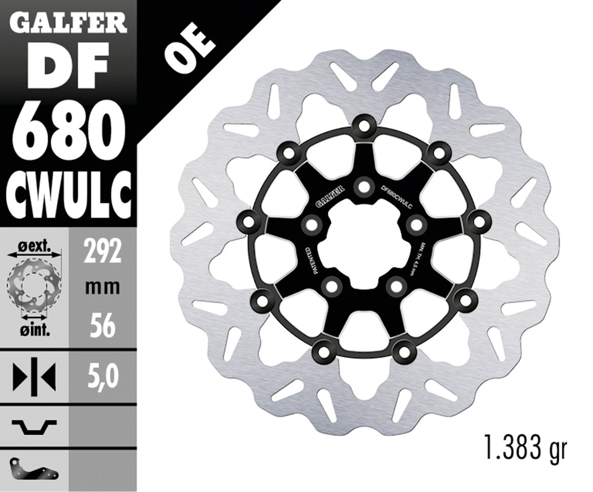 I dischi flottanti Galfer Wave offrono una frenata precisa ed efficiente e un notevole risparmio di peso. Se non diversamente indicato, sono dotati di nottolini in acciaio inox neri che fissano la pista frenante in acciaio inox alla parte centrale in alluminio. Sono utilizzabili con pinze di serie e di ricambio. Sono venduti singolarmente, ordinarne due per applicazioni a doppio disco. Come per ogni disco freno, si raccomanda vivamente di installare nuove pastiglie freno con un nuovo disco freno.
