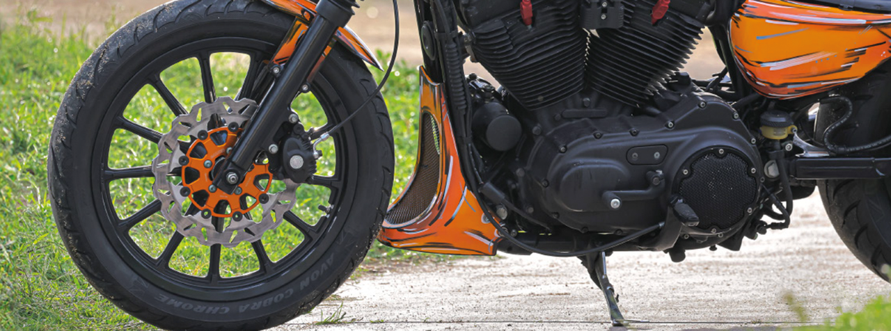 Anteriore per tutti i modelli a disco singolo e doppio Sportster 2000-2013, Touring 2000-2007, Dyna 2000-2005 e Softail 2000-2014Il disco montato su mozzo ha un diamentro esterno di 11 1/2″ (292mm), diametro interno 2 7/32″ e cinque fori scalinati da 5/16″su una circonferenza di 3 1/4″, Disco flottante Wave, parte centrale arancio