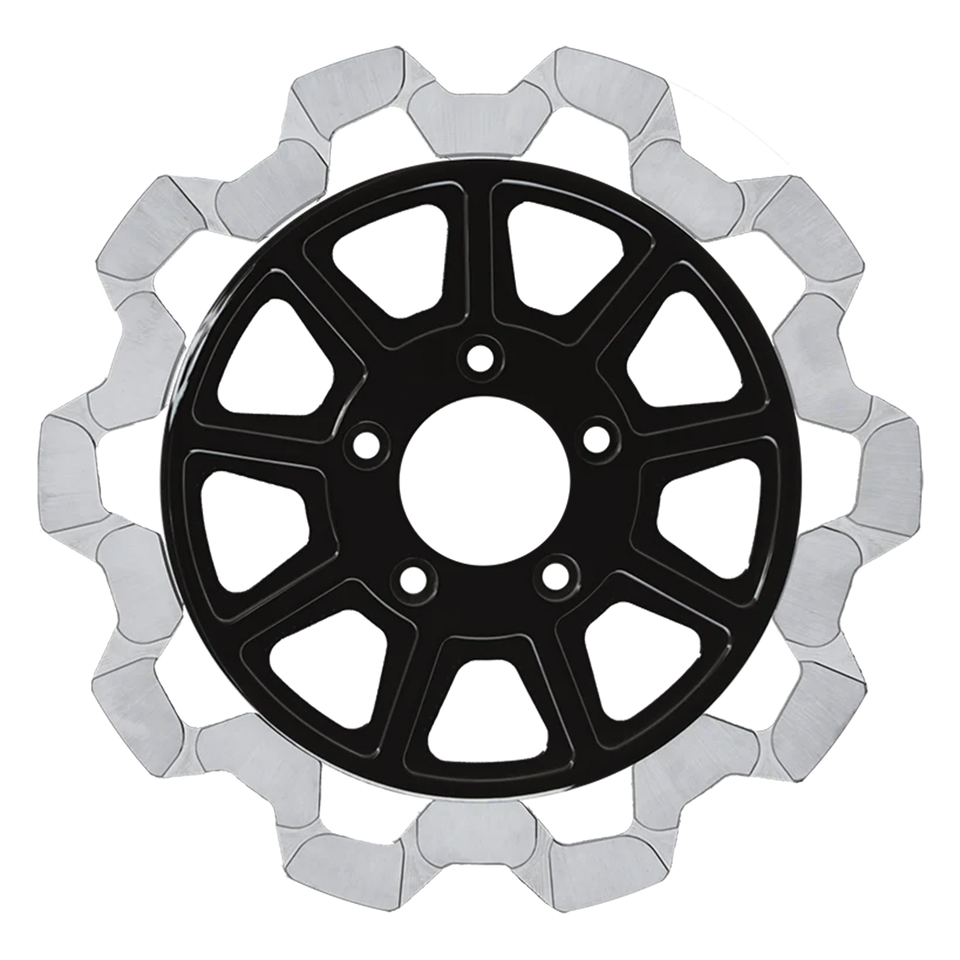 Anteriore per V-Rod 2007-2010, Dyna 2006-2017, Sportster XL 2014-2022, Touring 96, 103, 107, 110 & 114CI dal 2008 a oggi, Touring 117CI dal 2018 al 2023, Trike dal 2009 a oggi e Softail dal 2015 a oggiI dischi montati su mozzo hanno un diametro esterno di 11 8″ (300mm), diametro interno 2 7/32″ (56.4mm) e fori di montaggio scalinati da 5/16″ con un pattern di 5×3,25″ (82.6mm), Disegno-Bow Tie con centro nero e anello di attrito finito a macchina