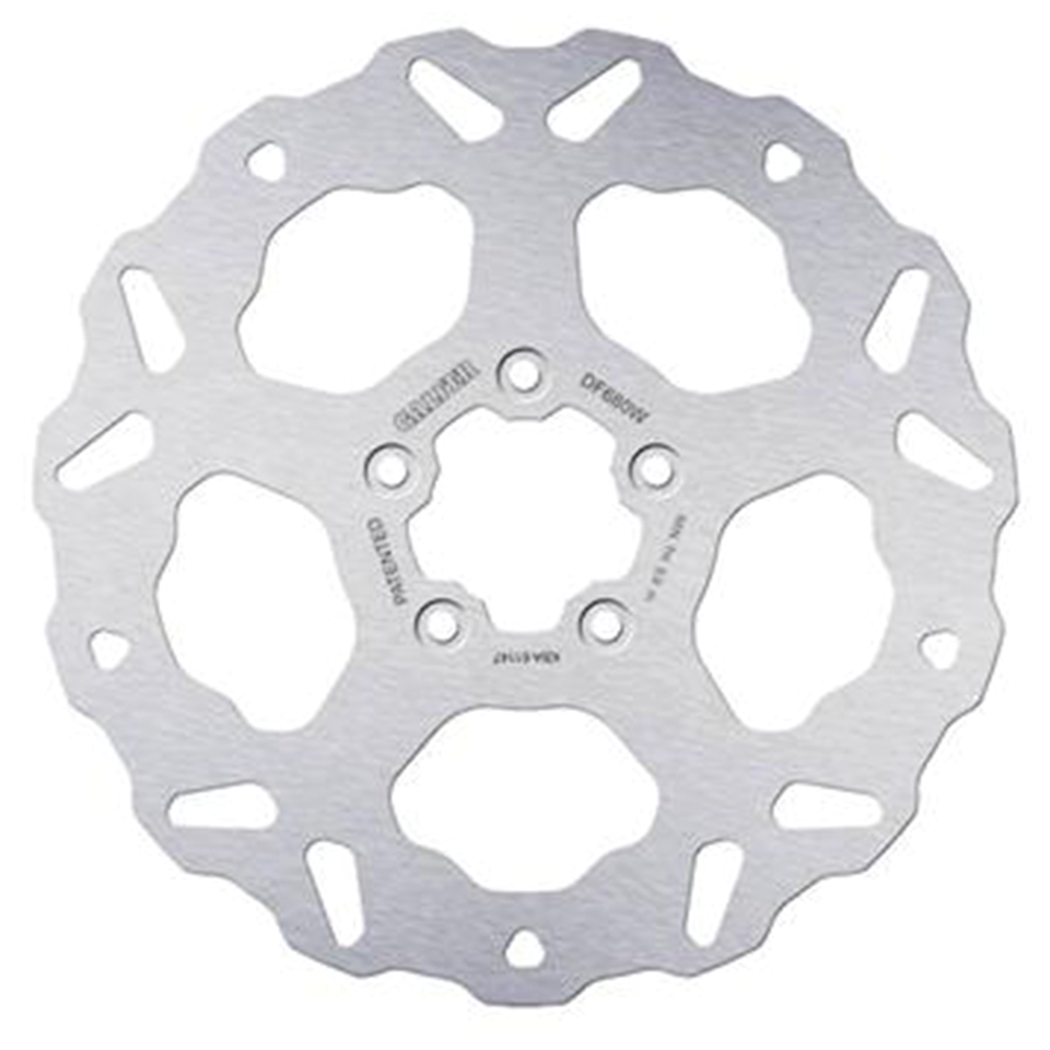 Anteriore per Sportster XL 2000-2013, Touring 2000-2007, Dyna 2000-2005 & Softail 2000-2014 Il disco ha un diametro esterno di 11 1/2″, un diametro interno di 2 7/32″ e 5 fori di montaggio scalinati da 5/16″ su un circonferenza di 3 1/4″, Disco fisso Wave