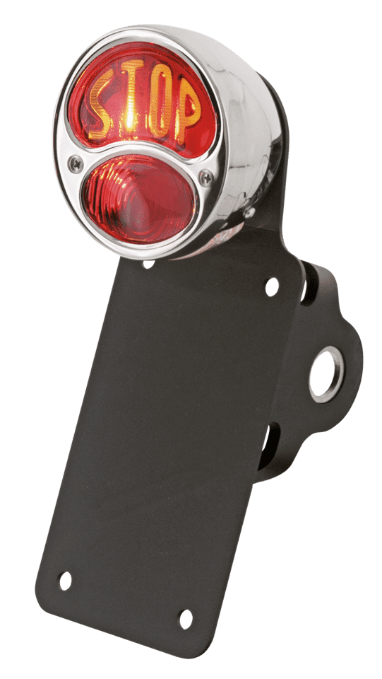 I fanali posteriori No school Choppers sono vere parti Custom di carattere! I fanali sono di acciaio inox lucidato con lampadine a doppio filamento da 12 Volt e sono una riproduzioni dei fanali Ford 1933-1936. Hanno l’approvazione DOT e una lente trasparente sul fondo per illuminare la targa. Per questi fanali abbiamo dei filtri per le lenti. Il filtro da montare sotto le lenti, appena frenate, darà un chiaro messaggio visibile a tutti! Disponibili con staffa per montaggio laterale sul vostro perno ruota o sull’attacco inferiore dell’ammortizzatore. Queste staffe sono costruite in acciaio e hanno una finitura nera a polvere e il portatarga cromato completo di tutta la minuteria per il montaggio. Il portatarga ha le misure americane di 7″x4″ (17.8×10 cm).