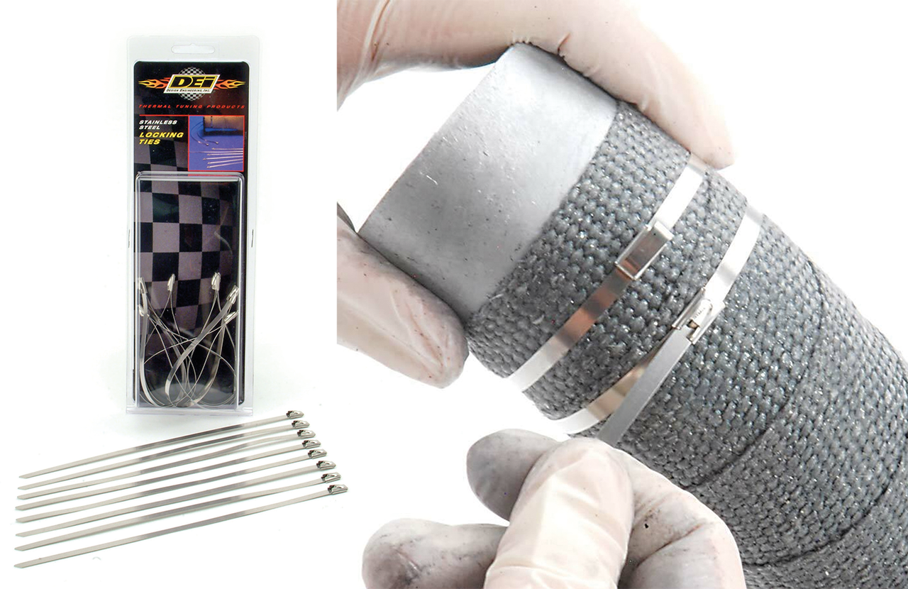 Le originali fasce isolanti per scarichi (Exhaust Insulating Wrap) sono state sviluppate nel 1986 da Thermo-Tec. Le fasce Exhaust Insulating Wrap sono una maniera innovativa per creare più potenza, mantenendo alta la temperatura dei gas di scarico in uscita. Si ha una produzione maggiore del volume di scarico e una diminuzione della temperatura di aspirazione. Le Exhaust Insulating Wrap resistono ad una temperatura continua fino a 2000°F e non contengono amianto. Le fasce Thermo-Tec non accumulano calore ma grazie ad uno speciale rivestimento Thermal-Conduction-Technology (TCT), sviluppato da Thermo-Tec, questo si trasmette attraverso la superficie delle fasce. Questo rivestimento particolare quindi controlla l’accumulo di calore e la dissipazione. Le Exhaust Insulating Wrap sono vendute in rotoli di 50 piedi (oltre 15 metri), con larghezza di 2″ ed hanno uno spessore di appena 1/16″. Per semplificare l’installazione e renderla più pulita, potete usare lo speciale nastro Snap-Strap, in acciaio inox sottilissimo. Esso può essere tagliato facilmente nella lunghezza desiderata e fissato con delle clips apposite. Il nastro di fissaggio è venduto in kit contenente 8 pezzi lunghi 9″ e 20 clip.
