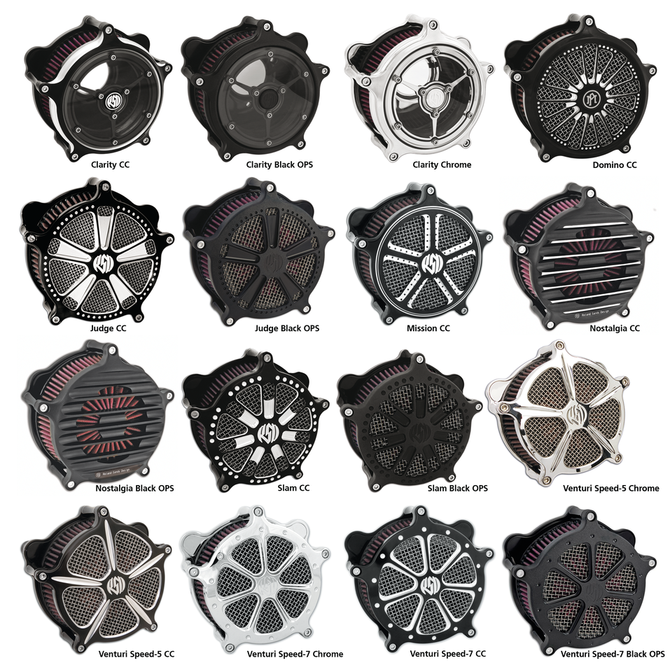 Progettato da Roland Sands questo filtro ad alto flusso “Venturi” è costruito in alluminio billet con macchine CNC. Ha un filtro esposto a cinque razze ed una piastra di fondo che esalta il flusso dell’aria nel carburatore o nel corpo farfallato aumentando la potenza. Gli sfiati sono integrati nella piastra. Disponibile cromato, nero anodizzato “Contrast Cut” e nelle nuova finiture esclusive di RSD con due tonalità “Black Ops”. Include elemento filtrante ad alto flusso K&N e minuteria per il montaggio.
