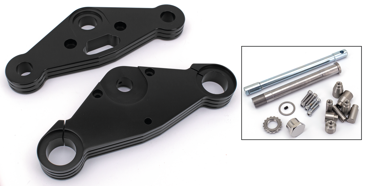 Queste forcelle in alluminio billet “Made in Europe” sono qualcosa di differente! Presentano massicce piastre forcella, foderi di grosso diametro con copertura, gli steli completamente nascosti e perno ruota a scomparsa. Queste forcelle in esclusiva da Zodiac non hanno paragoni in prezzo e qualità! Non importa se vorrete usarle come ricambio a quelle di serie o per un progetto Custom, vi daranno in ogni modo quel look grasso e massiccio che è ora molto do moda. Piastre, foderi e coperture foderi sono costruite in alluminio billet ed hanno una finitura a specchio o nera. La piastra superiore è spessa 1 1/8″ (29mm), quella inferiore 1 5/16″ (34mm). Le coperture foderi e le gambe inferiori hanno l’impressionante diametro di 2 3/8″ (60mm). I foderi inferiori, hanno i supporti parafango e per le pinze freno per doppio disco. Le piastre di supporto per le pinze OEM o aftermarket sono disponibili, ma vanno ordinate separatamente. Altre piastre di supporto vanno costruite appositamente. Il perno anteriore è a scomparsa per un look ultra filante. Disponibile nelle lunghezze +3″, +4″, +6″, +8″, +12″, +14″ e +16″ over stock rispetto alle forcelle FL, e con inclinazione delle piastre di 0, 3 e 6 gradi. Queste forcelle sono fornite di 3 differenti fermi forcelle per adattarsi a qualsiasi tipo di telaio stock o aftermarket. L’installazione su Dyna 2006-2017 richiede l’acquisto separato di un kit perno canotto e distanziale, ZPN 600129 per forcelle lucide o ZPN 600130 per forcelle nere. Una confezione di olio forcella è incluso in ogni set forcella.