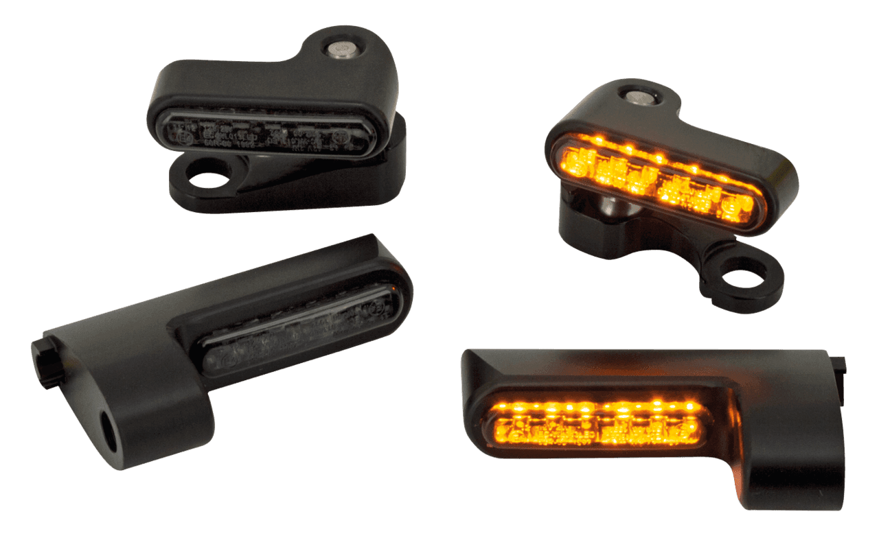 Queste frecce approvate a LED sono progettate per essere un ricambio diretto per Dyna, Sportster e Softail. Le frecce anteriori includono una staffa di montaggio universale o lo snodo a sfera come su quelle di serie mentre quelle posteriori si montano direttamente sul parafango posteriore. Disponibili cromate, nere anodizzate o ottone per molti modelli recenti.