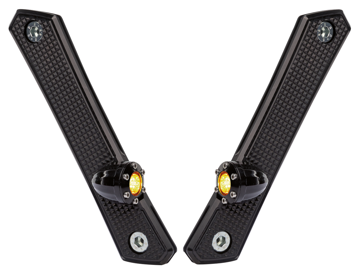 Kit di frecce anteriori in alluminio billet progettate e costruite in Italia. Facili da installare, si montano sui fori di serie usando la bulloneria inclusa..Per FLHX, FLHXS & FLHXSE Street Glide dal 2006 a oggi e FLHXXX Street Glide Trike 2010-2011. Vendute in coppia destra e sinistra.