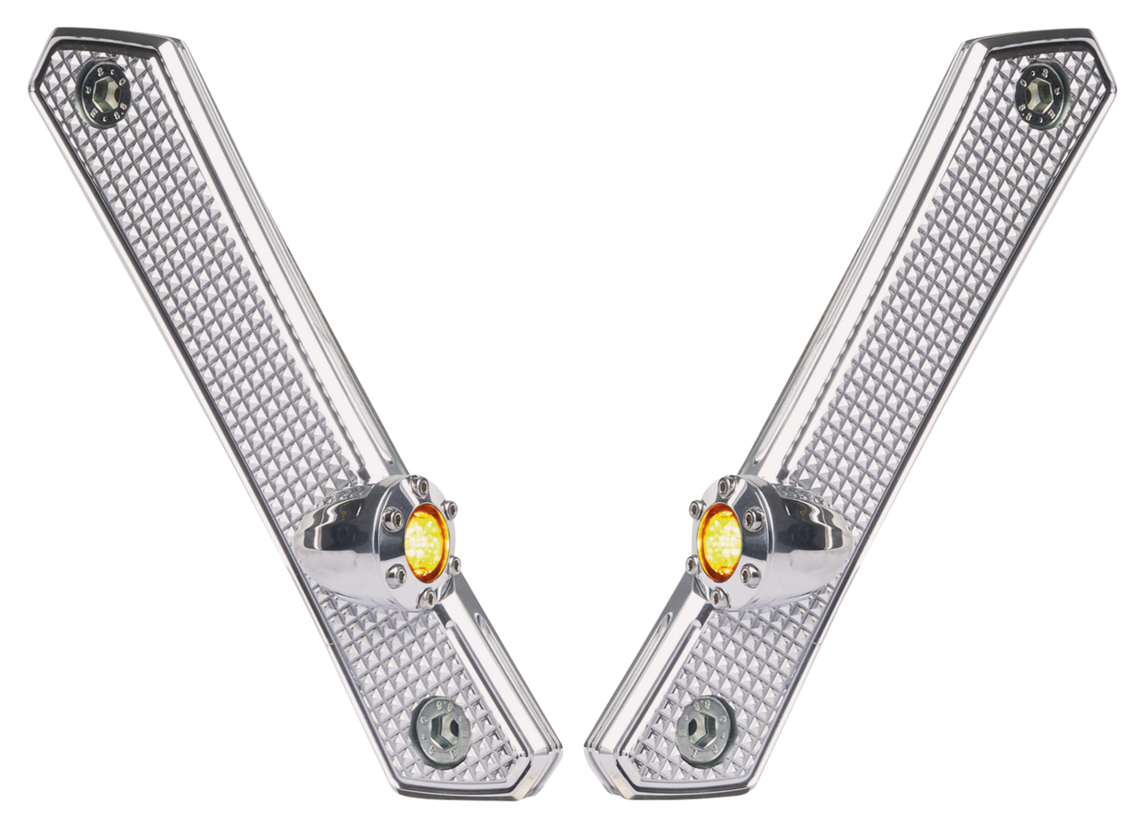 Kit di frecce anteriori in alluminio billet progettate e costruite in Italia. Facili da installare, si montano sui fori di serie usando la bulloneria inclusa..Per FLHX, FLHXS & FLHXSE Street Glide dal 2006 a oggi e FLHXXX Street Glide Trike 2010-2011. Vendute in coppia destra e sinistra.