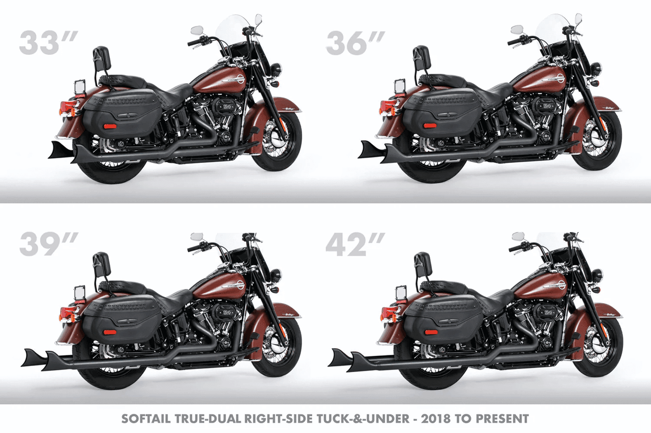 2018-2020 SoftailMilwaukee Eight, Versioni omologate CE, Euro 4, 107CIRichiede adattatori quando installato su FLHC & FLHCS Heritage, FLSB Sport Glide et FXLRST Low Rider ST con supporti borseL’uso 2-Up richiede il kit di riposizionamento delle pedane passeggero, Nero, 33″ terminale