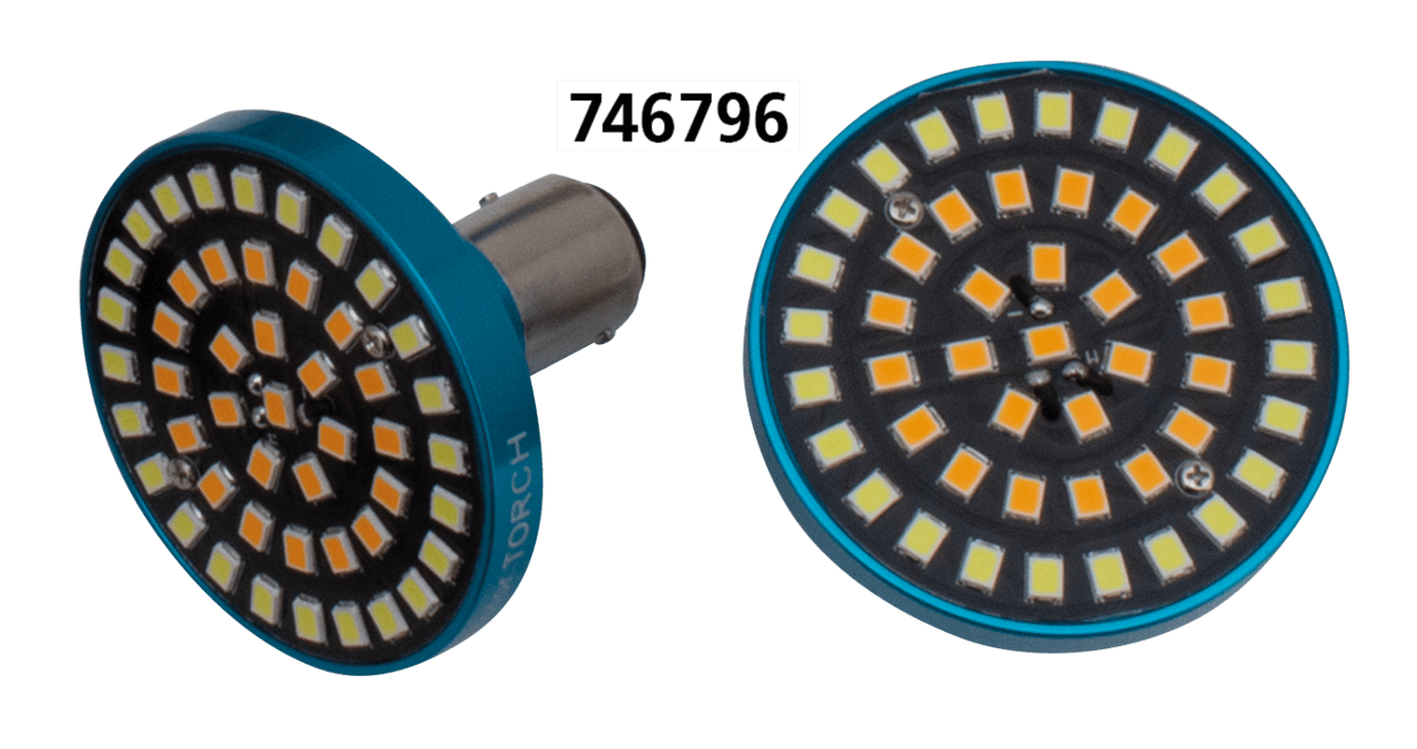 Per indicatori di direzione stile Deuce da 2″ (50,8mm) di diametro con lenti click-on/click-off, Set di due inserti per luci di posizione/di svolta anteriori con circuito Can bus incorporato per eliminare la necessità di un equalizzatore di carico. Hanno LED bianchi halo per le luci di marcia e LED ambra per la direzione. Gli inserti sostituiscono le lampadine a doppio filamento sui modelli USA. I modelli europei richiedono prese per lampadine a doppio filamento e ricablaggio. Utilizzare con lenti chiare o fumé