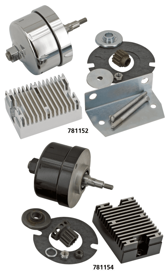 Ora potrete convertire la vostra vecchia Harley a generatore al più affidabile sistema ad alternatore 12V che eroga 17Amp. Alternatore si monta al posto del generatore. Kit include alternatore, regulatore/raddrizzatore, ingranaggio, kit deflettore dell’olio e viti di montaggio. Nei Big Twin 1941-1957 I fori delle viti del generatore vanno allargate a 5/16″ per permettere il montaggio delle viti generatore fornite.