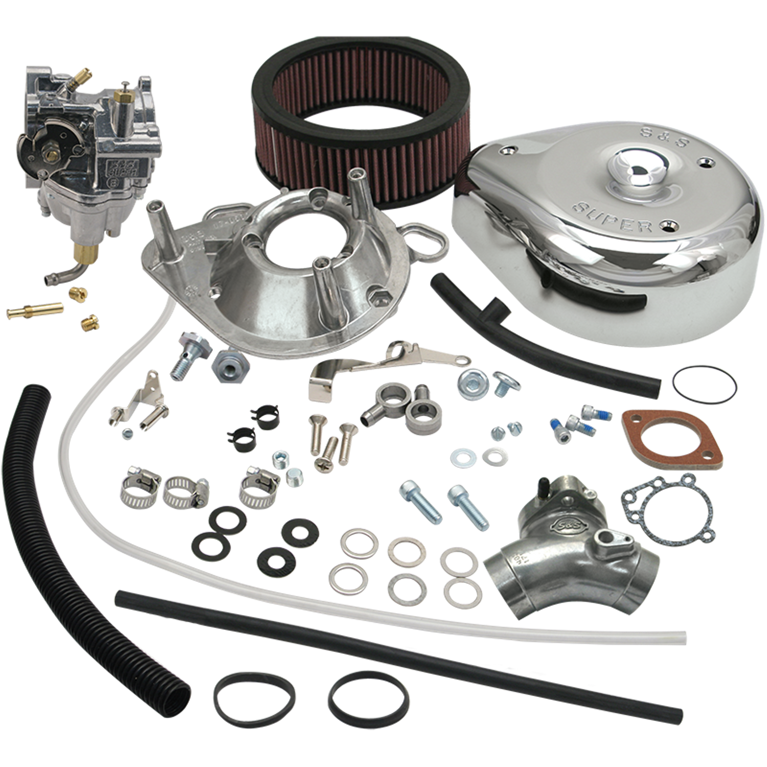 Sistemi alimentazione per kit da 95″ A scelta con carburatore Super E o sistema iniezione singolo S&S EFI o variabile S&S VFI. Se usato un kit VFI su modelli 1999-2005 è raccomandato l’uso di senzore a circuito chiuso. In addizione al filtro aria a goccia, offriamo sistema ad induzione per migliorare entrata aria e performance. Kit carburatore con filtro aria “Teardrop”, Kit carburatore Super E, 1999-2005