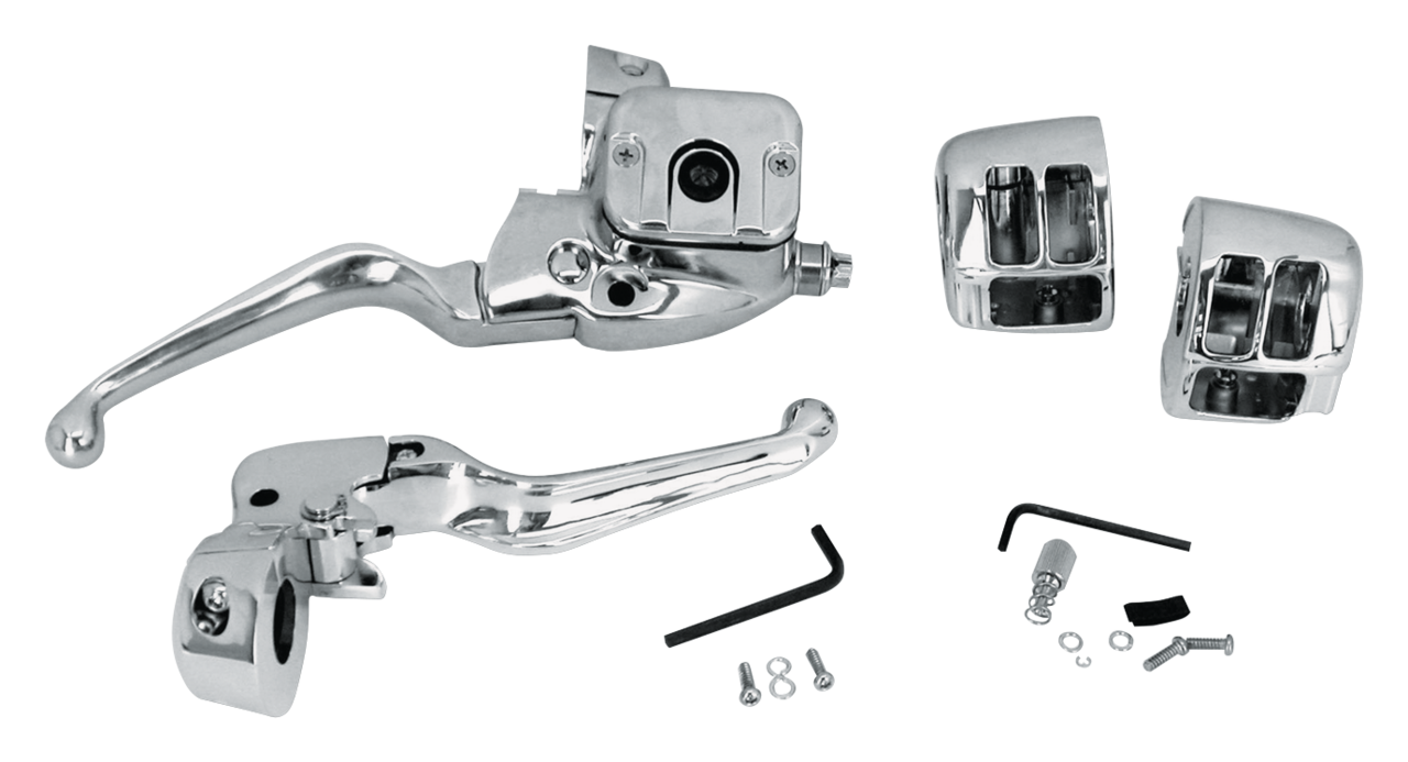 Questi kit comandi manubrio con finitura cromata sono una versione rinnovata nello stile di quelli OEM montati su Big Twin e Sportster dal 1996 ad oggi. Il kit contiene una pompa freno anteriore, la leva frizione con relativo morsetto, gli alloggiamenti degli interruttori destro e sinistro e tutto il necessario per il montaggio. Disponibili con pompa freno da 9/16″ e 5/8″ per disco singolo e 11/16″ per doppio disco. Gli alloggiamenti interruttori sono una riproduzione di quelli OEM con finitura cromata ed accettano sia gli interruttori OEM, sia quelli aftermarket per Sportster 1996 a oggi e 1996-2006 Softail & Dyna.