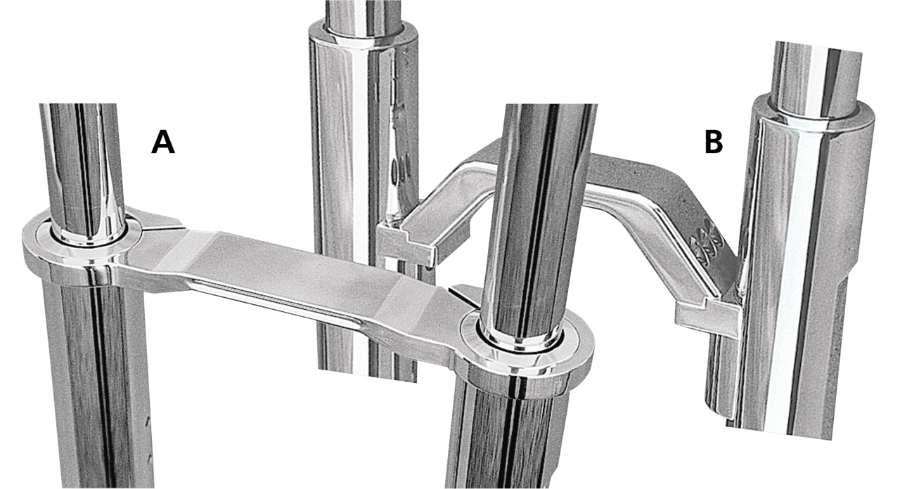 Antisvirgolo e distanziali Tweek Bars sono meglio conosciute come piastre anti svirgolo, e sono altamente raccomandate per l’uso di steli 10″ o superiori alla lunghezza originale. Montano con piastre Wide Glide (largh. 250mm) e foderi TolleGlide., Piastra antisvirgolo in un pezzo lucidata