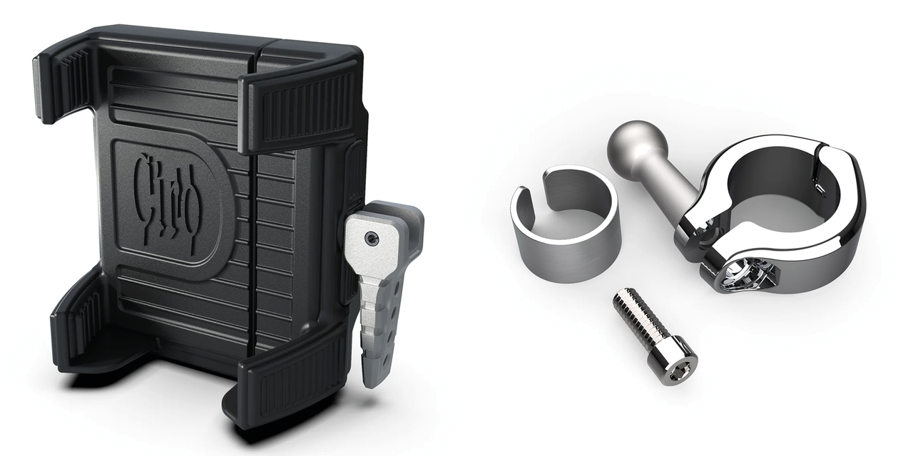 Questi accessori ti permettono di montare il tuo telefono o la tua macchina fotografica su qualsiasi perno a sfera Ciro. Ha modelli di bulloni e supporti per i più comuni supporti per telefoni e fotocamere. Quando non vuoi preoccuparti di scaricare la batteria del tuo telefono durante la guida, ti suggeriamo il Ciro Premium Smartphone attacco con la sua spina USB integrata da 1,3 amp, in modo da poter caricare mentre guidi usando il cavo USB del tuo dispositivo. Il CyberCharger è meglio per te se hai uno smartphone che supporta la ricarica wireless. I supporti Budget e Premium si adattano a dispositivi da 2 1/8″ a 3 1/2″ (da 54 a 89mm) di larghezza, il CyberCharger prende dispositivi da 2 3/8″ a 4″ (da 60 a 102mm) di larghezza. Per le videocamere d’azione abbiamo un adattatore specifico disponibile.