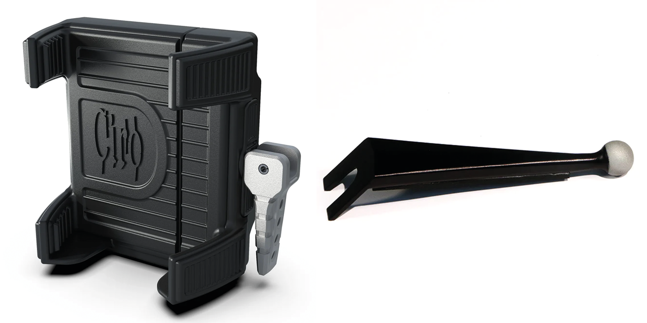Questi accessori ti permettono di montare il tuo telefono o la tua macchina fotografica su qualsiasi perno a sfera Ciro. Ha modelli di bulloni e supporti per i più comuni supporti per telefoni e fotocamere. Quando non vuoi preoccuparti di scaricare la batteria del tuo telefono durante la guida, ti suggeriamo il Ciro Premium Smartphone attacco con la sua spina USB integrata da 1,3 amp, in modo da poter caricare mentre guidi usando il cavo USB del tuo dispositivo. Il CyberCharger è meglio per te se hai uno smartphone che supporta la ricarica wireless. I supporti Budget e Premium si adattano a dispositivi da 2 1/8″ a 3 1/2″ (da 54 a 89mm) di larghezza, il CyberCharger prende dispositivi da 2 3/8″ a 4″ (da 60 a 102mm) di larghezza. Per le videocamere d’azione abbiamo un adattatore specifico disponibile.