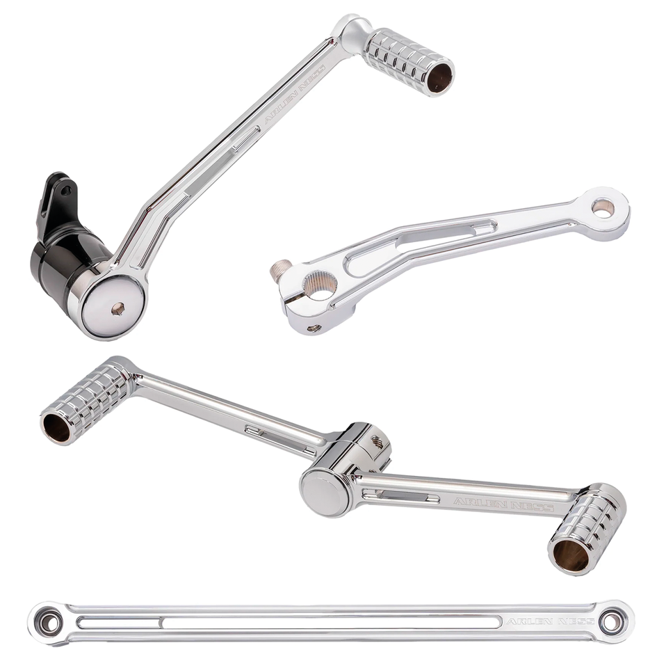 Il kit Arlen Ness include leva del cambio interna, leva freno, leva cambio punta/tacco e asta rinvio cambio Deep Cut. Tutte le parti sono in alluminio billet.