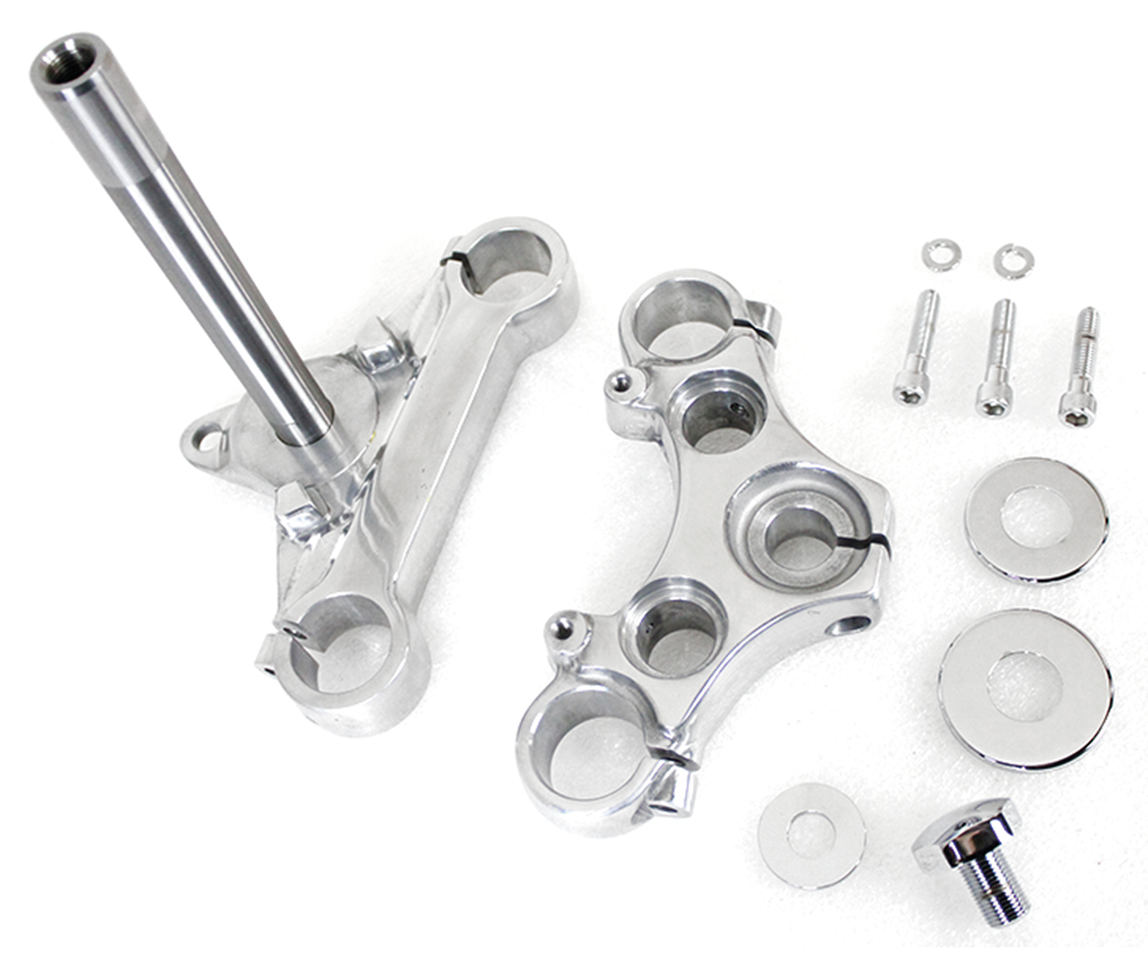 Le piastre inferiori di questi kit sono realizzate come ricambio di serie nei modelli prodotti per il mercato nazionale statunitense. L’uso nei modelli prodotti per l’Europa può richiedere la foratura del foro per il bloccasterzo stile Neimann e/o il taglio dell’orecchio per il bloccasterzo tipo lucchetto dei modelli USA. Non vi è alcuna differenza tra le piastre superiori per i modelli nazionali statunitensi e quelli europei. Tutti i kit includono una piastra superiore della forcella e una piastra inferiore della forcella.