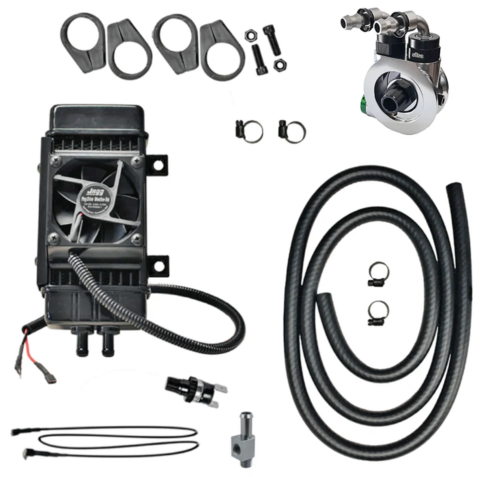 Prestazioni superiori in una confezione compatta, il radiatore Jagg con ventola assistita è progettato per lavorare sia abasse velocità e nelle continue soste nel traffico che nei viaggi uin autostrada. Progettato per soddisfare la richiesta di raffreddamento dei motori V-Twin più recenti. Terminali lisci e una verniciatura nera lucida aiutano questo radiatore a mimetizzarsi nel telaio per un aspetto più pulito. Il radiatore è montato sul tubo sinistro del telaio e distanziato in maniera da permettere il flusso dell’aria sia al radiatore che al cilindro del motore. Il radiatore è montato sul telaio usando dei robusti supporti in Uralite dal look pulito e con caratteristiche ammortizzanti. Questo radiatore a 10 tubi offre una superficie di raffreddamento superiore rispetto alla concorrenza. La speciale valvola in linea aggiunge efficienza con una minima perdita di pressione e restrizione. In alluminio con finitura a polvere. La ventola Jagg WeatherTek, a prova di polvere ed impermeabile si aziona automaticamente a circa 100°C (210°F) a spinge 75cfm verso il radiatore. I kit sono forniti con l’adattore filtro olio Jagg a controllo termostatico che fornisce un facile accesso alla mandata dell’olio per l’installazione del radiatore. L’adattatore stile sandwich è ricavato da due pezzi di alluminio billet quindi anodizzato nero satinato. Si installa tra il filtro dell’olio e l’attacco del filtro dell’olio ed è progettato con la stessa tecnologia Hyper Flow di tutti i componenti Jagg. Il sistema di radiatore Jagg con ventola assistita è fornito completo con tutto il necessario per il montaggio e semplici istruzioni dettagliate.