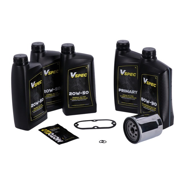 Include: 3 litri di olio motore minerale SAE 20W50, filtro olio cromato 63798-99A, 1 litro di olio per carter primario, 1 litro di olio per trasmissione 80W90, guarnizione del coperchio di ispezione 60567-65B / 60567-90C, tappo di scarico con O-ring 11105. Olio motore multigrado Vspec SAE 20W50 minerale di qualità per moto che richiedono olio motore minerale. Soddisfa o supera JASO MA/2. Il nostro kit “Big Oil” include abbastanza olio motore, trasmissione e primario Vspec per la manutenzione dei modelli specifici come menzionato. Il kit include un filtro olio avvitabile cromato o nero e tutte le guarnizioni del tappo di scarico necessarie e una guarnizione/guarnizione del coperchio di ispezione/derby primario per portare a termine il lavoro. Il kit “Big Oil” è perfetto per la manutenzione completa dell’olio della tua moto durante un intervallo di manutenzione regolare o prima di riporla per il periodo invernale. Nota: viene fornito con olio motore Vspec originale di alta qualità per tutti i motori di serie e ad alta potenza. Nota: i numeri di parte OEM sono forniti solo a scopo di riferimento. Nota: l’olio usato può contenere acidi nocivi e/o altri contaminanti. Pertanto si consiglia di effettuare un cambio dell’olio e del filtro prima del rimessaggio invernale. Nota: controllare il manuale di assistenza per gli intervalli di cambio dell’olio consigliati in fabbrica e le quantità di cambio dell’olio.