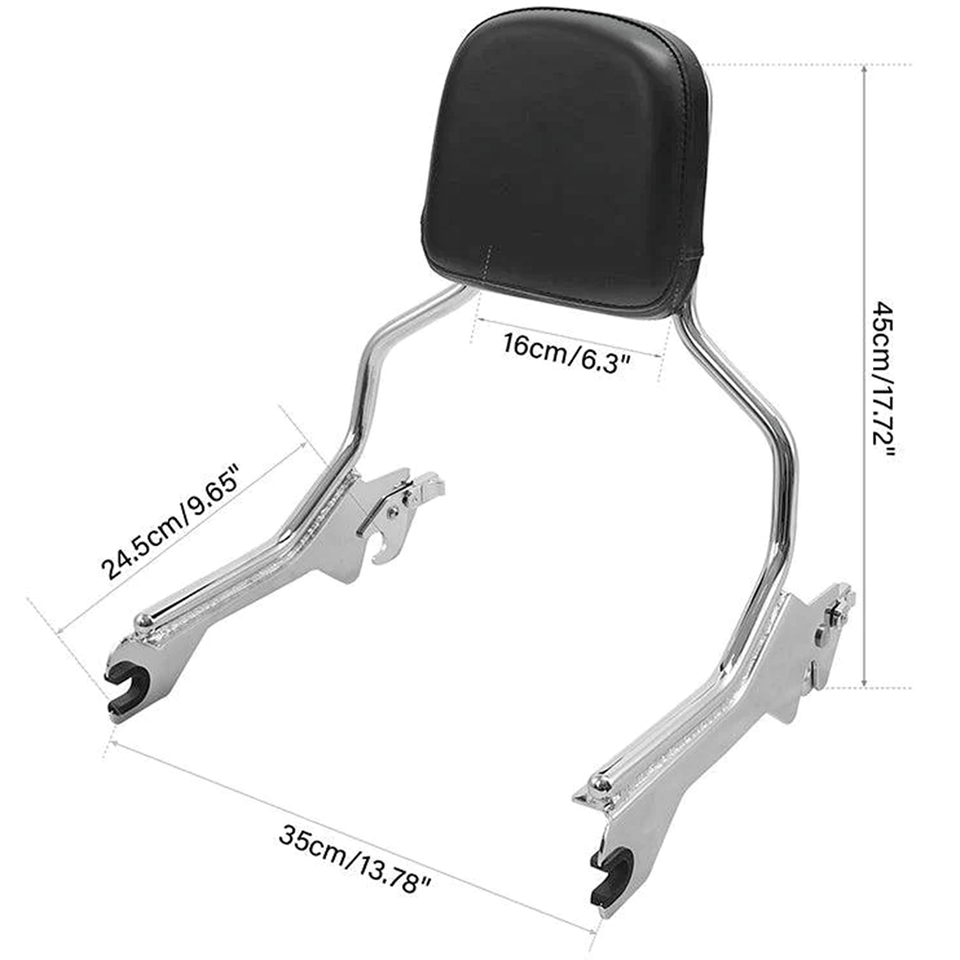 Un sissy bar in un unico pezzo elimina la necessità di piastre laterali separate. Il sissy bar in tubo tondo è dotato di una parte superiore con contraccolpo e viene fornito con il cuscinetto posteriore abbinato in un pratico kit. Si monta e si smonta in meno di un minuto. Il kit ha un’altezza totale di 45cm, il cuscino è largo 16cm e alto 19cm.
