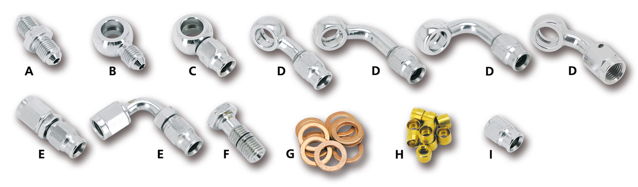 Con queste parti di alta qualità puoi assemblare qualsiasi condotto di freno o frizione idraulici con qualsiasi combinazione di raccordi ed adattatori per ogni realizzazione o modello. I condotti rivestiti di acciaio inox sono in PTFE, molto resistenti alle dilatazioni dovute ad alta pressione ed a elevata temperatura, e garantiscono una pressione costante e quindi una risposta più efficiente e mai “spugnosa”. Possono sopportare una pressione di oltre 840 Bar (12.000 psi). La normale pressione di utilizzo di un impianto frenante è di “solo” 210 Bar. I condotti sono disponibili in tre tipi: con treccia d’acciaio inox, con treccia d’acciaio ricoperta di tubo trasparente o “Carbon look”. I raccordi sono riutilizzabili, estremamente facili da montare e disponibili cromati, in acciaio inox naturale ed in acciaio inox nero.