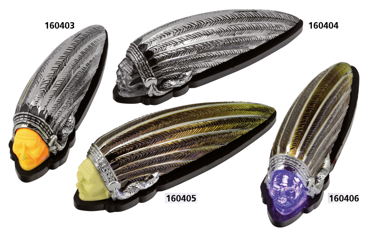 In fusione d’alluminio con finitura cromata o classica rossa e oro a polvere. Lunghezza 6″ (152mm) e con lampadina tradizionale a 12 volt o a LED.