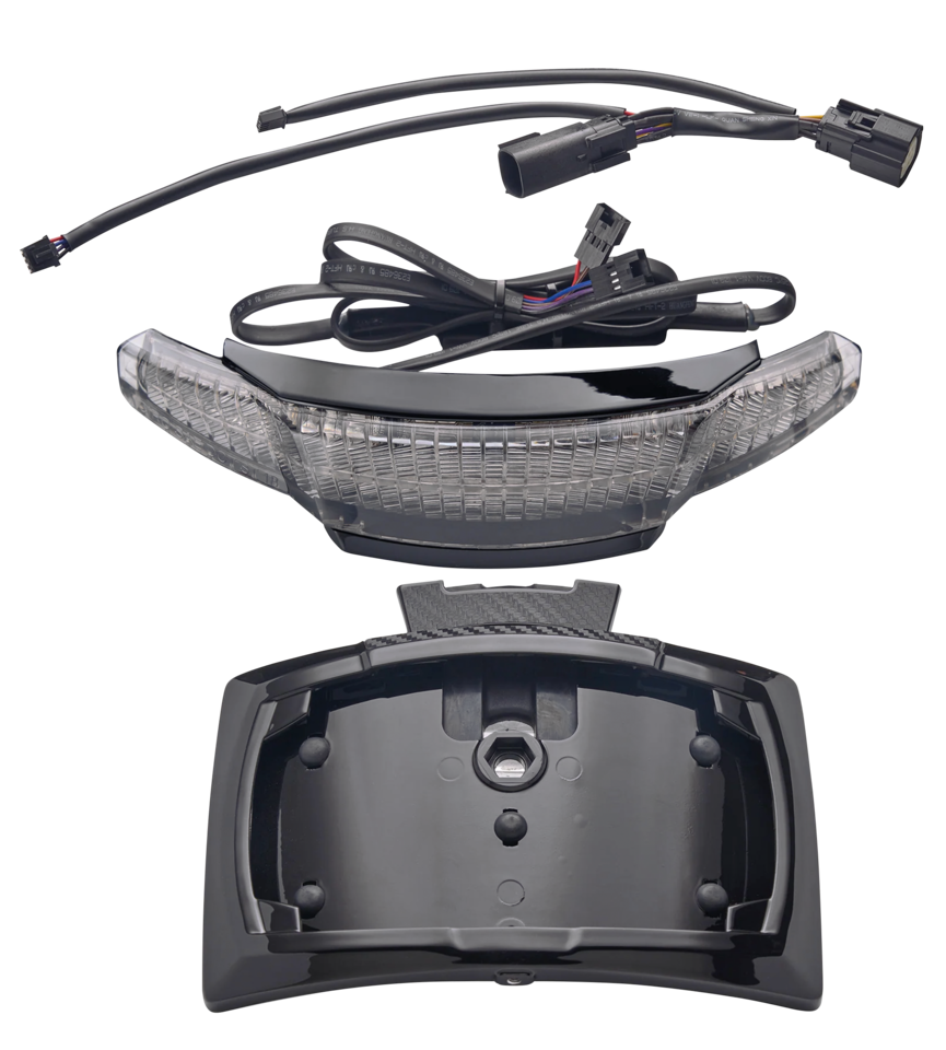 Uno dei modi più radicali per personalizzare il parafango posteriore che consente di controllare queste luci con l’app gratuita Lightstrike di Ciro per oltre un centinaio di combinazioni di illuminazione diverse con gli accessori Lightstrike. La luce a led plug and play sostituisce l’intero gruppo ottico OEM con luci di marcia e stop rosse, gli indicatori di direzione sono rossi in stile USAo ambra selezionabili dall’app. Le luci sono dotate di un supporto unico per targhe americane di dimensioni 7“ x 4” (178 x 102 mm) con fissaggi nascosti per trasformare la parte posteriore della moto. Le luci non sono approvate dall’UE.