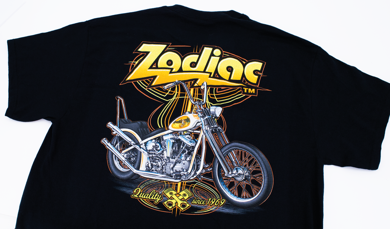 Portate il Capitano Larry sulle vostre spalle con una di queste magliette in puro cotone di alta qualità. Design anni Settanta con logo Zodiac retrò con il rigido Pan/Shovel Captain Larry hardtail sul retro e logo Zodiac del XXI secolo sul davanti. Taglie USA!