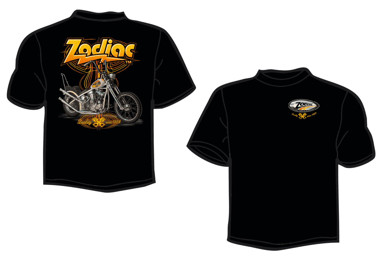 Portate il Capitano Larry sulle vostre spalle con una di queste magliette in puro cotone di alta qualità. Design anni Settanta con logo Zodiac retrò con il rigido Pan/Shovel Captain Larry hardtail sul retro e logo Zodiac del XXI secolo sul davanti. Taglie USA!
