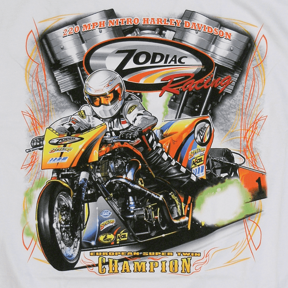 Magliette di alta qualità della moto dragster Zodiac Racing pluricampione europea, costruita e assistita dal Capo meccanico Vincent Pels e dal genio della meccanica Ton Pels, padre fondatore di Zodiac. Queste magliette mostrano Ronny Aasen prendere il volo con il Godfather VII Nitro Harley-Davidson per un altro passaggio da 220 MPH (355 km/h) in 6 secondi. Stampate fronte/retro. Taglie US!