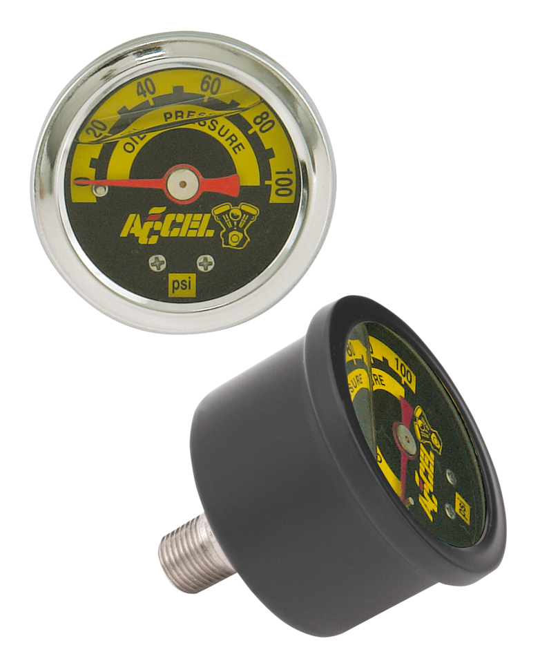 Il manometro Accel con attacco posteriore da 1/8″ NPT è il migliore in assoluto. La lente di questo strumento da 1 1/2″ è in vetro, per cui non si scolorisce o distorce. La cassa è in acciaio inossidabile e gli elementi interni in ottone sono immersi in un bagno di glicerina che assorbe le vibrazioni.