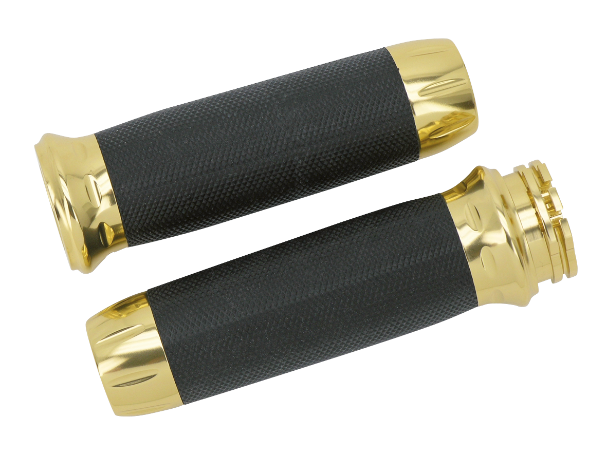 Set di manopole in alluminio billet con gomma antiscivolo. Disponibili, cromate, bronzo, nero con tagli a contrasto, nero Stealth e bronzo Stealth. La finitura Stealth è una conbinazione di colore lucido e opaco.