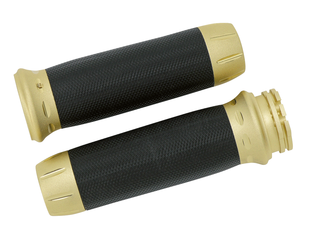 Set di manopole in alluminio billet con gomma antiscivolo. Disponibili, cromate, bronzo, nero con tagli a contrasto, nero Stealth e bronzo Stealth. La finitura Stealth è una conbinazione di colore lucido e opaco.