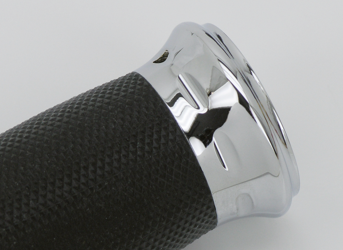 Set di manopole in alluminio billet con gomma antiscivolo. Disponibili, cromate, bronzo, nero con tagli a contrasto, nero Stealth e bronzo Stealth. La finitura Stealth è una conbinazione di colore lucido e opaco.