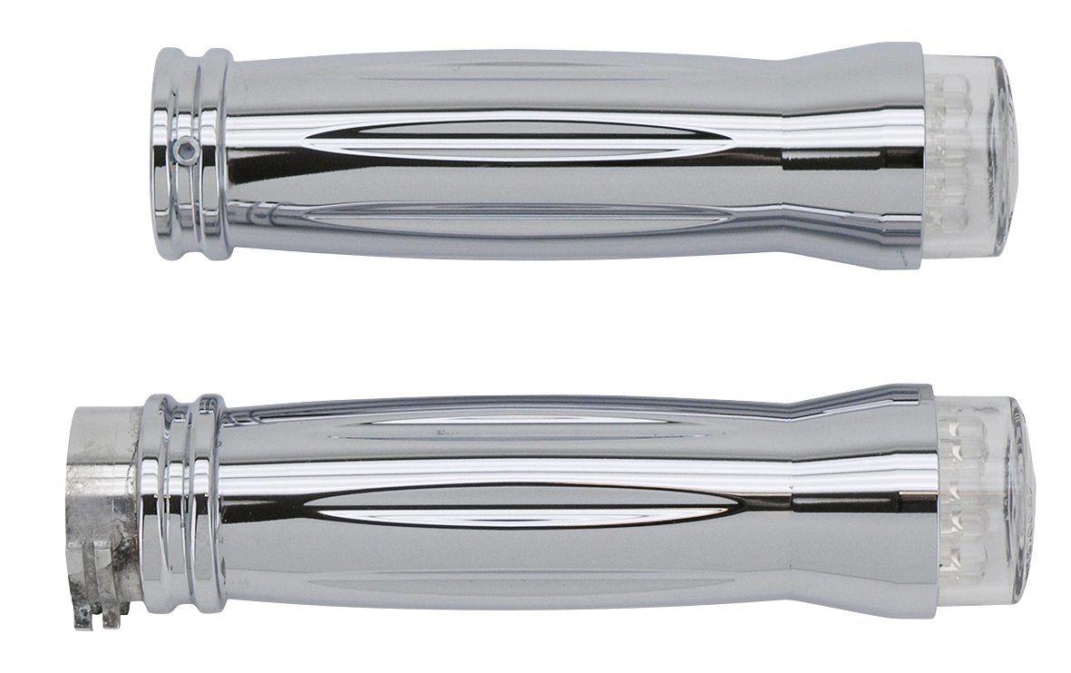 Costruite da RBS in alluminio billet. Queste stilose manopole sono complete di indicatori di direzione integrati a LED approvati. Per tutti i modelli dal 1973 ad oggi escluso quelli con aria nel manubrio. Sono forniti in quattro stili differenti con finitura cromata lucidata o nera a polvere.