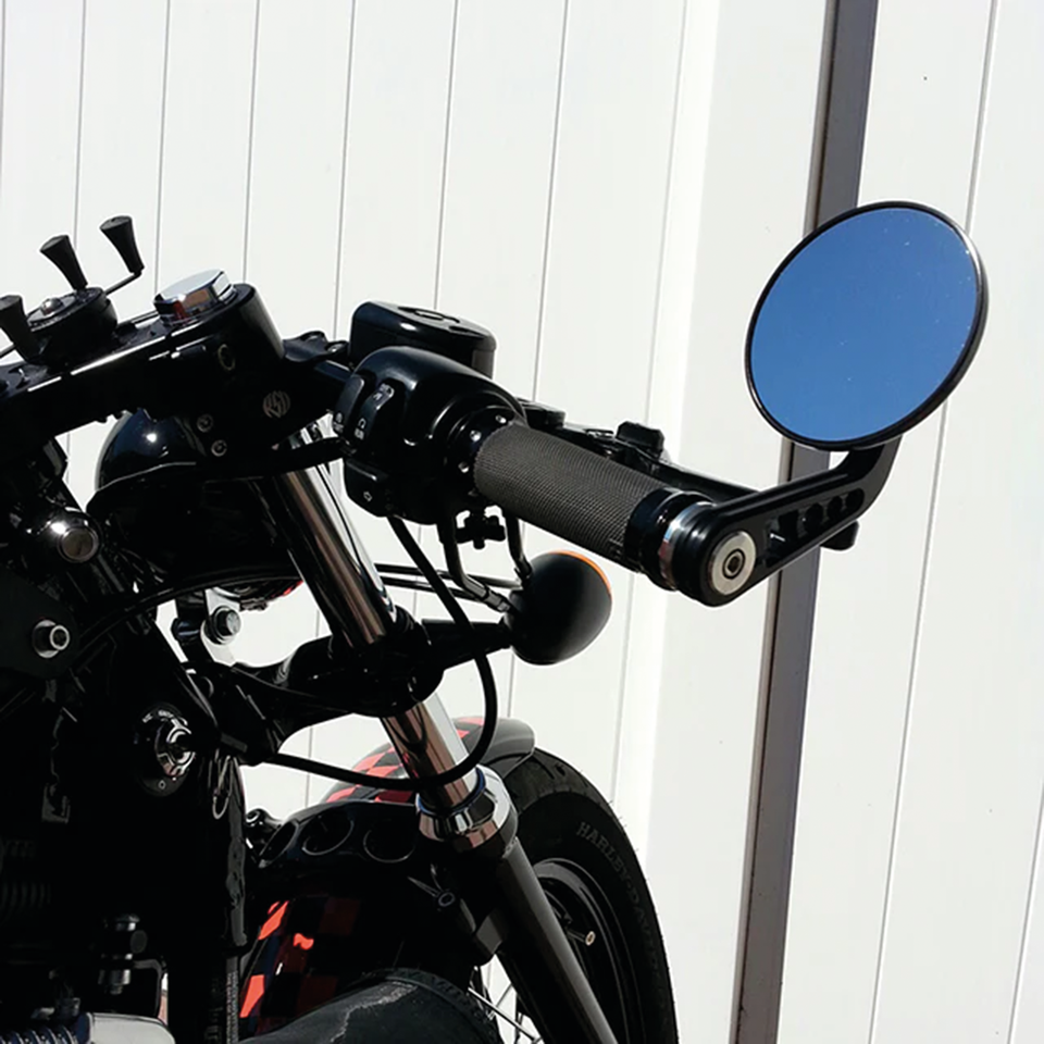 Specchietti da estremità manubrio, venduti singolarmente, Tondo diametro 3 1/4″ (83mm), stelo angolato, anodizzato nero