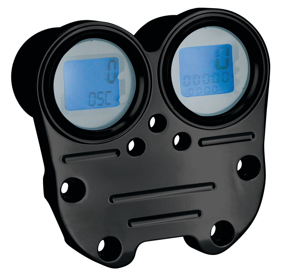 Combinazione contachilometri/contagiri RBS da manubrio con montaggio dirittoContachilometri e contagiri integrati in una staffa in alluminio billet che monta su tutti i riser tipo di serie dal 1973 ad oggi con interasse trai fori di 3 1/2″ (89mm) e fori disassatii. La staffa diritta è lunga 5 1/2″ (140mm), larga 5 11/16″ (144mm) e profonda 3 19/32″ (91mm). Preforata per adattare luci spie, che sono vendute separatamente., Nero
