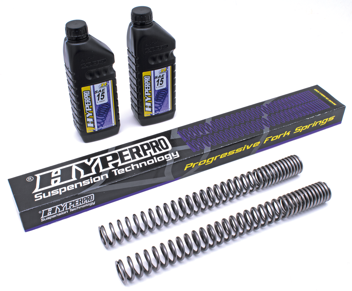 Hyperpro ha dedicato anni di ricerche per lo sviluppo dinamico della tecnologia delle molle da corsa e per applicazioni speciali. Anni di ricerca e sviluppo su forcelle, ammortizzatori, molle e sistemi di sospensione si completano nella filosofia Hyperpro. Spesso una molla lineare è troppo dura o troppo morbida all’inizio e/o alla fine della corsa. Le cosiddette molle progressive a due stadi sono un miglioramento, ma restano un compromesso tra sicurezza e comfort. Il passaggio da soffice a duro è spesso percepito con incertezza e può portare ad ondeggiamenti in velocità. Hyperpro ha formulato una soluzione senza compromessi: il disegno di curva “Link System” per molle. Con questo tipo di costruzione una molla può essere disegnata per soddisfare tutte le richieste della moderna tecnologia. Hyperpro ti dà una parte iniziale della corsa di grande sensibilità, con una durezza costantemente crescente per sicurezza ed antiaffondamento a fine corsa. Grazie all’uso di materiali di alta qualità e lavorazioni di precisione si hanno le migliori molle in commercio. Le molle sono costruite su standard DIN-2095 classe 1, accuramente lucidate per ridurre gli attriti e garantite contro la rottura. Kit completi di molle, un litro di olio per sospensioni Hyperpro, un tubetto di lubridficante Hyperpro e un manuale professionale per la messa a punto delle sospensioni.