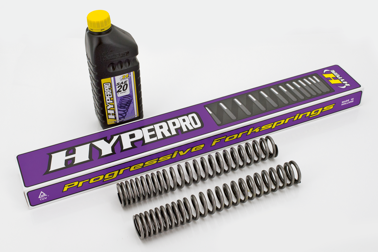 Hyperpro ha dedicato anni di ricerche per lo sviluppo dinamico della tecnologia delle molle da corsa e per applicazioni speciali. Anni di ricerca e sviluppo su forcelle, ammortizzatori, molle e sistemi di sospensione si completano nella filosofia Hyperpro. Spesso una molla lineare è troppo dura o troppo morbida all’inizio e/o alla fine della corsa. Le cosiddette molle progressive a due stadi sono un miglioramento, ma restano un compromesso tra sicurezza e comfort. Il passaggio da soffice a duro è spesso percepito con incertezza e può portare ad ondeggiamenti in velocità. Hyperpro ha formulato una soluzione senza compromessi: il disegno di curva “Link System” per molle. Con questo tipo di costruzione una molla può essere disegnata per soddisfare tutte le richieste della moderna tecnologia. Hyperpro ti dà una parte iniziale della corsa di grande sensibilità, con una durezza costantemente crescente per sicurezza ed antiaffondamento a fine corsa. Grazie all’uso di materiali di alta qualità e lavorazioni di precisione si hanno le migliori molle in commercio. Le molle sono costruite su standard DIN-2095 classe 1, accuramente lucidate per ridurre gli attriti e garantite contro la rottura. Kit completi di molle, un litro di olio per sospensioni Hyperpro, un tubetto di lubridficante Hyperpro e un manuale professionale per la messa a punto delle sospensioni.