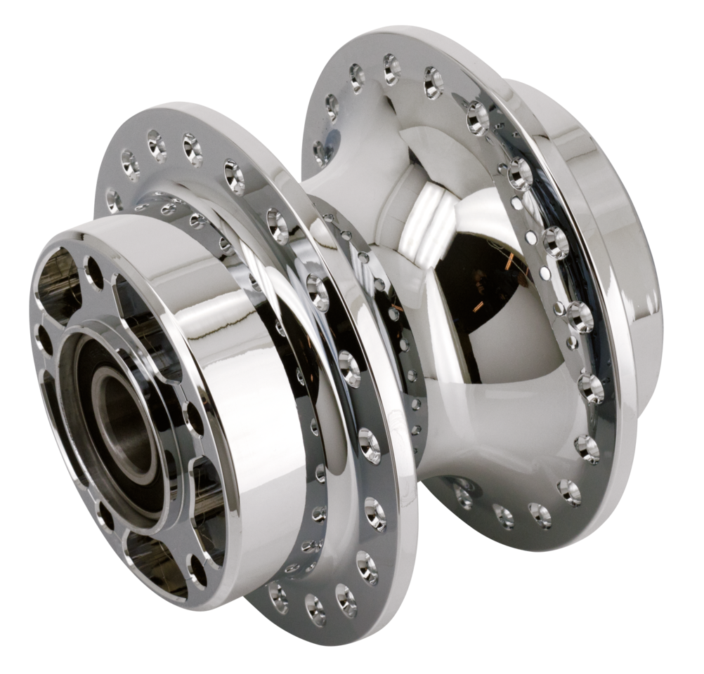 Mozzi ruota anteriori per Sportster, Sportster XL1200X Forty Eight 2010-2015 e XL1200C Custom dal 2011 a oggi con cerchio anteriore a 40. Lega cromata per perni ruota da 25mm e disco singolo senza ABS, V-Twin Mfg.