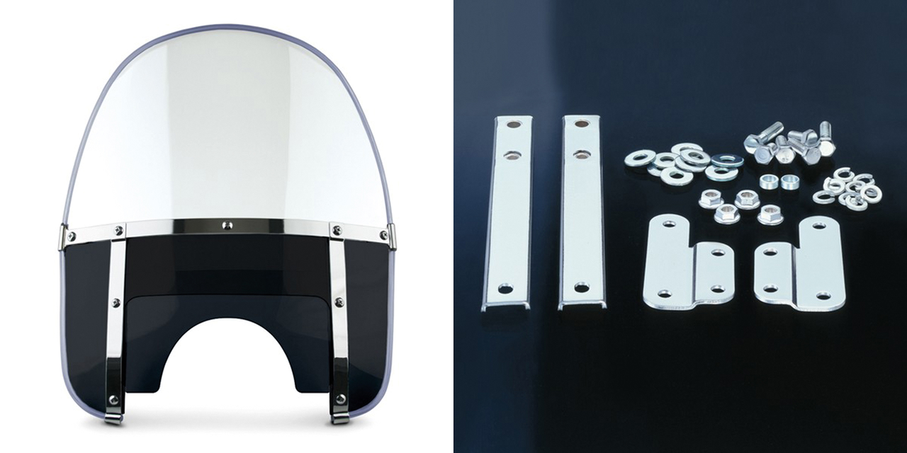 Per forcelle da 41mm senza barra luci spot OEM o aftermarket su FLS & FLSS Softail Slim 2012-2017, FLST & FLSTC Softail Heritage 1986-2017, FLSTF, FLSTFB & FLSTFBS Fat Boy 1990-2017, FLSTN Softail Nostalgia, Special e Deluxe 1993-2017 Nota: I modelli FLST, FLSTC e FLSTN che hanno già gli attacchi parabrezza OEM possono essere equipaggiati con I parabrezza ZPN710675, 710676, 710677 o 710678 senza staffe di montaggio, Kit parabrezza completo con parte superiore tonda standard, trasparente con parte inferiore nera