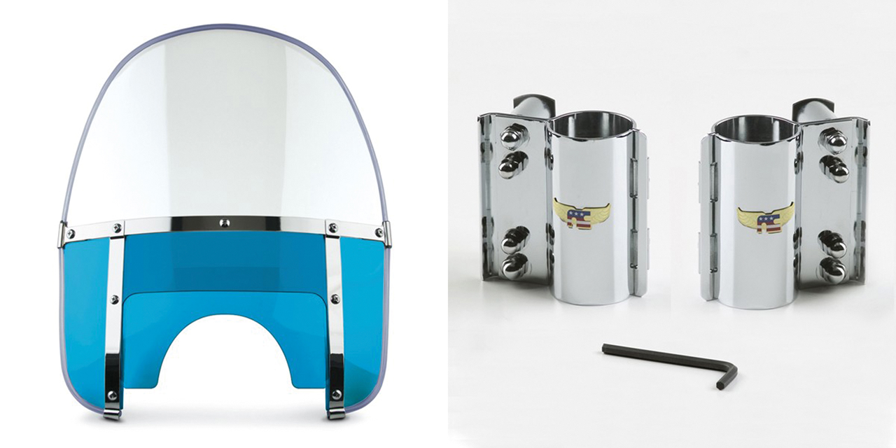 Per forcelle da 41mm su FXWG 1980-1985, FXDG Disc 1983, FXDWG 1993-2005, FXST & FXSTC Softail 1984-2012, FXSTB Night Train 1999-2007 e FXSTD Deuce 2000-2007, Kit parabrezza completo con parte superiore tonda standard, trasparente con parte inferiore blu
