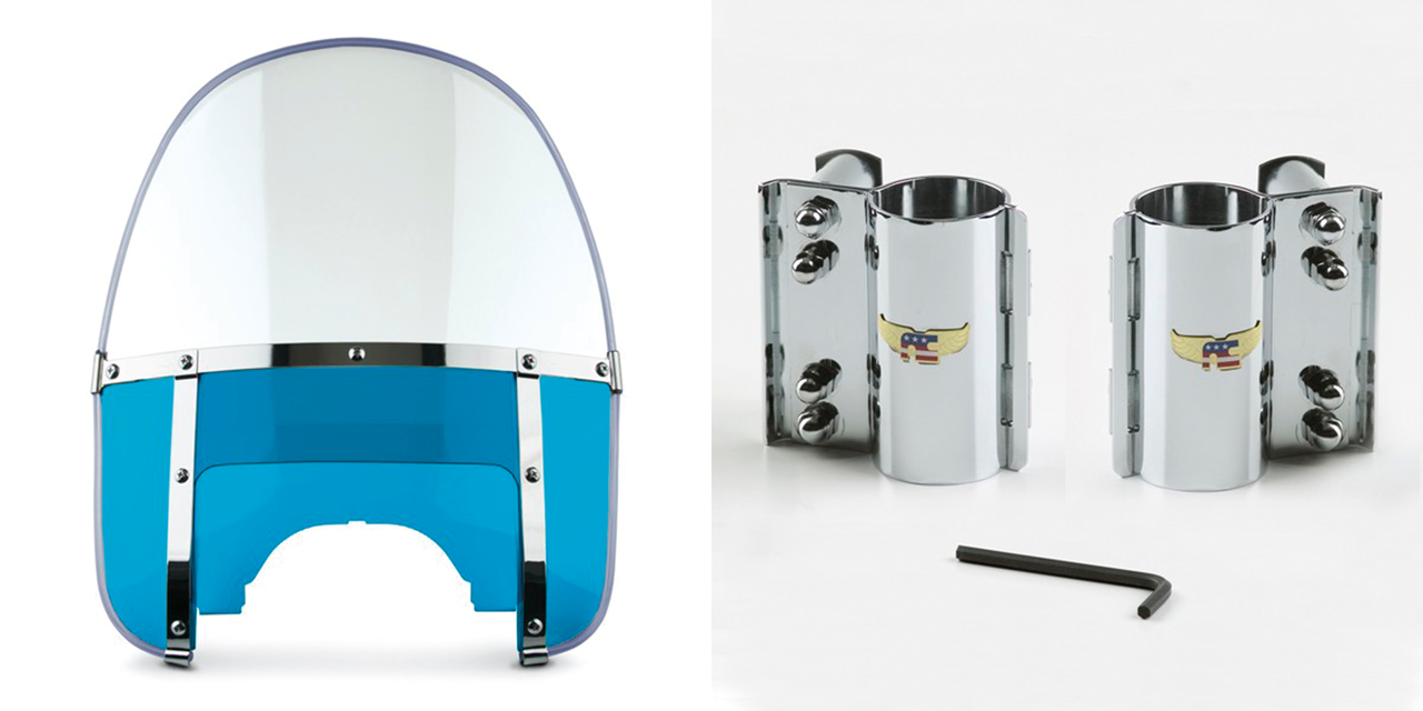Per forcelle da 41mm su FXWG 1980-1985, FXDG Disc 1983, FXDWG 1993-2005, FXST & FXSTC Softail 1984-2012, FXSTB Night Train 1999-2007 e FXSTD Deuce 2000-2007, Kit parabrezza completo con parte superiore tonda stile 1960-1984, trasparente con parte inferiore blu