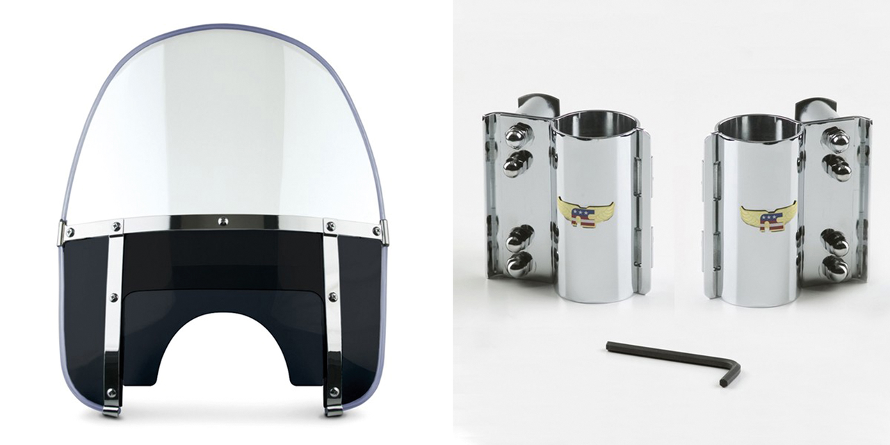 Per forcelle da 41mm su FXWG 1980-1985, FXDG Disc 1983, FXDWG 1993-2005, FXST & FXSTC Softail 1984-2012, FXSTB Night Train 1999-2007 e FXSTD Deuce 2000-2007, Kit parabrezza completo con parte superiore tonda standard, trasparente con parte inferiore nera
