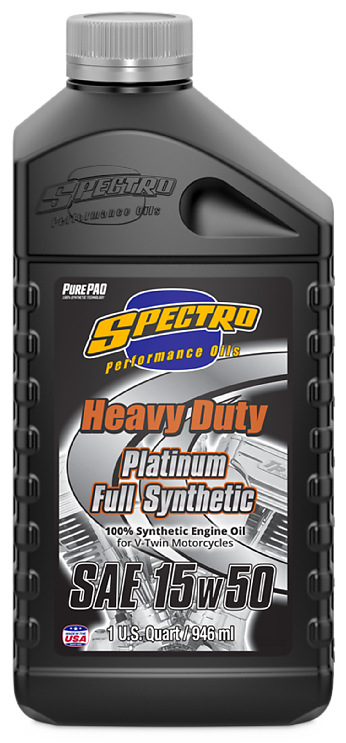 Il prodotto più recente della linea Heavy Duty V-Twin di Spectro. Questo olio motore Platinum 100% sintetico SAE 15W-50 è stato creato appositamente per le motociclette Harley-Davidson. Olio motore 100% sintetico, miscelato con tecnologia PurePAO 100% sintetica. Consente intervalli di manutenzione prolungati.