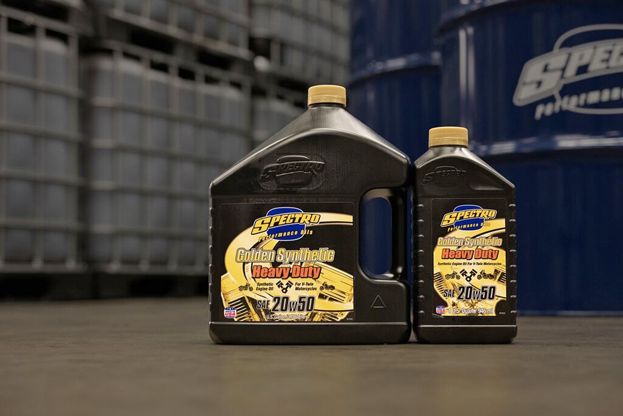 Il nuovissimo olio sintetico per motori V-Twin di Spectro. Questo olio sintetico riduce l’attrito, offre un’eccellente lubrificazione e garantisce una protezione superiore in condizioni di calore estremo. Gli oli base sintetici Heavy Duty Golden del gruppo 3 sono combinati con i più avanzati additivi antiusura disponibili per ridurre l’usura, prolungare la durata dei componenti ed eliminare l’incollaggio delle valvole. Soddisfa tutti i requisiti di garanzia OEM conosciuti