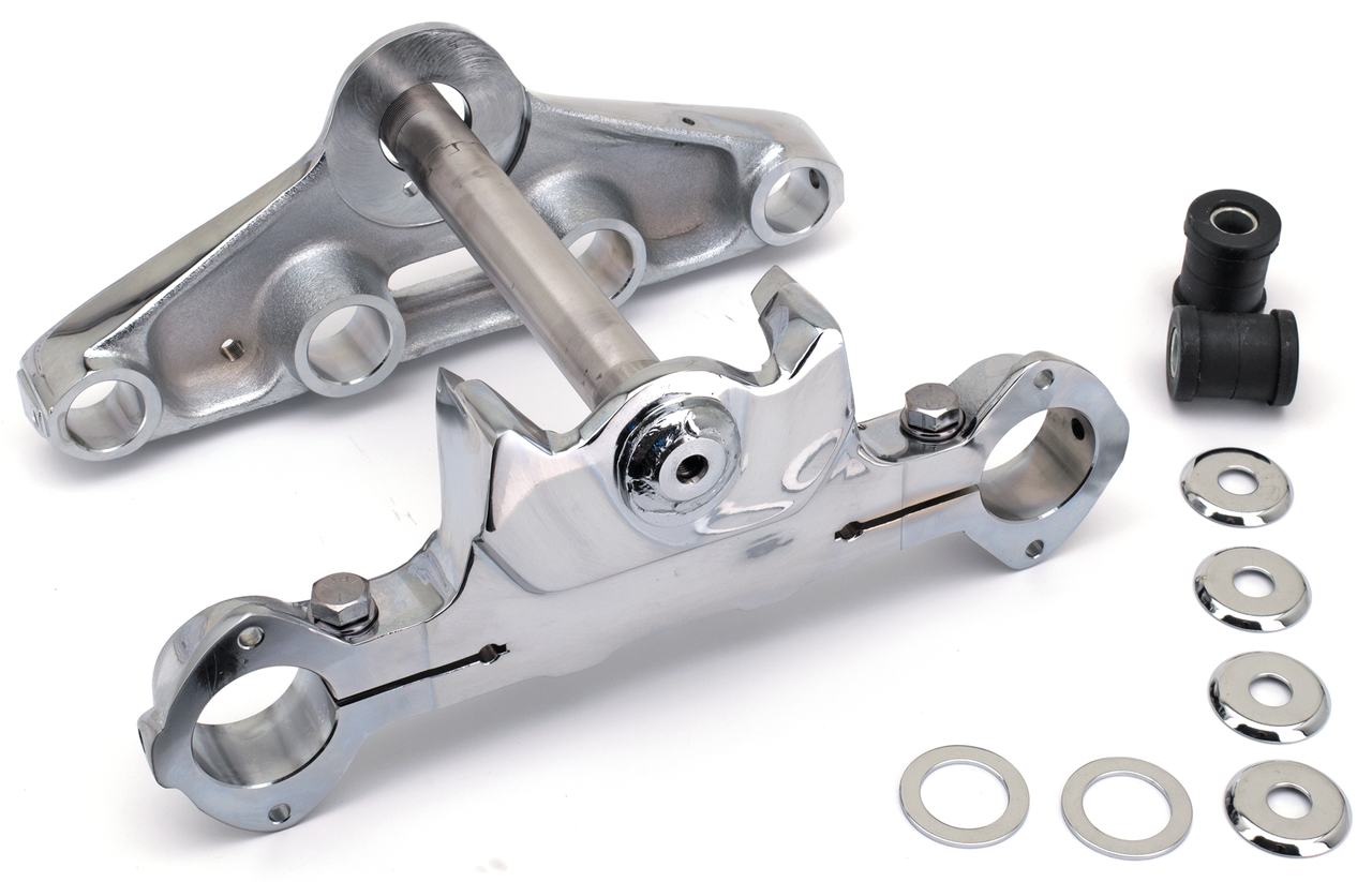Set di piastre forcella inferiori e superiori forgiati a in stile FL Wide Glide 4 marce, utilizzati su Hydra Glide da 41mm di diametro del 1948-1976 e nelle forcelle Showa da 41mm di diametro del 1977-1984. Le piastre di ricambio di serie hanno un’inclinazione negativa di 2 gradi. La versione custom ha un’inclinazione di zero gradi come le piastre delle FXWG 1980-1986 e delle FXST 1984-1987, ma ha i fermi forcella e gli occhielli per i copriforcella come sulle FL 4 marce e non ha la linguetta di blocco della forcella. Entrambe possono essere utilizzate anche sui Softail 1984-1999 e sulla maggior parte dei telai custom che utilizzano coppe separate per i cuscinetti Timken e perni di sterzo da 1″ di diametro.