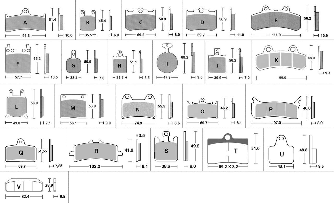 Molti utenti Harley per aumentare la capacità di frenata della propria moto montano pinze freno aftermarket. Questa tabella vi mostra con facilità che tipo di pastiglie dovete ordinare, quando avete bisogno di sostituirle. Noi offriamo set di pastiglie freno di ricambio, per la maggior parte delle pinze PM e GMA, EBC organiche/Aramid, sinterizzate HH in lea di rame, seie V semi-sinterizzate e SBS in versione ceramica/sinterizzata e in Carbonio. Queste pastiglie sono approvate EEC, DOT e R.F.A. e sono famose per la durata e la performance ad ogni condizione e sono dotate di un indicatore d’usura. Noi abbiamo menzionato il tipo ed il modello di tutte le pinze freno di cui disponiamo, ma queste pastiglie sono adattabili a molti altri tipi di pinze. Le foto e le misure vi aiuteranno ad ordinarle. Fornite in coppia.